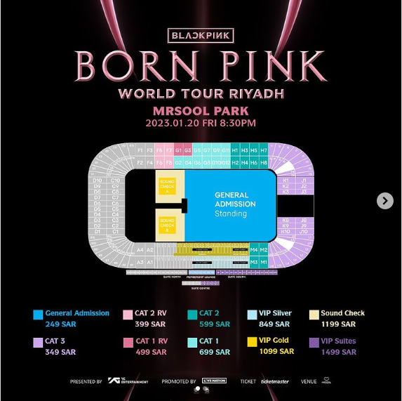 Tiket konser akan dirilis dalam dua fase, yang pertama pada 8 November untuk anggota FANCLUB dan yang kedua pada 11 November untuk semua pengunjung melalui Live Nation. Partisipasi band ini di Musim Riyadh adalah bagian dari tur dunia ketiganya “Born Pink,” yang akan dilakukan di kota-kota seperti Manila, Abu Dhabi, Kuala Lumpur, Jakarta, Bangkok dan Hong Kong.