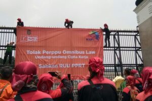 Di depan gedung DPR MPR RI di Jakarta Pusat, hari Senin (13/3/2023), aksi massa Partai Buruh mengajukan beberapa tuntutan kepada