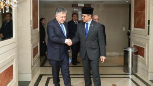 Sugiono, selaku Menteri Luar Negeri RI, lakukan pertemuan bilateral dengan Omar Paganini, yang merupakan Menteri Luar Negeri Uruguay, pada saat