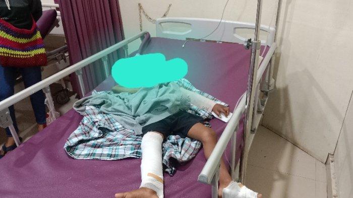 Korban mengalami luka-luka di kepala dan bibir serta tangan dan kaki bengkak akibat penganiayaan yang dilakukan oleh kedua pelaku. (Sumber Foto : DIDIE SW/dok. Kompas.com)