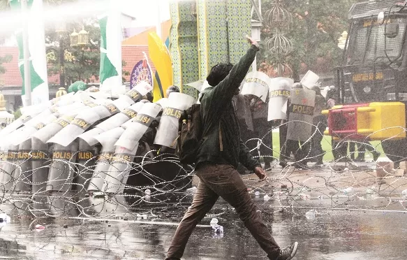 Massa tersebut mengenakan pakaian hitam dengan pita putih di lengan kiri. (Sumber Foto : Shutterstock)