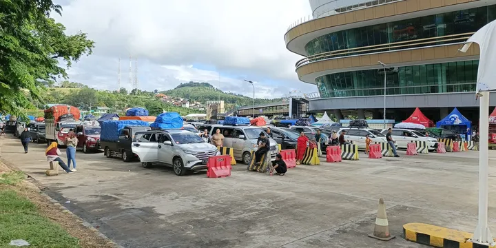 Kemacetan terjadi di Jalan Lintas Sumatera, juga dikenal sebagai Jalinsum, sepanjang satu kilometer menuju pelabuhan.