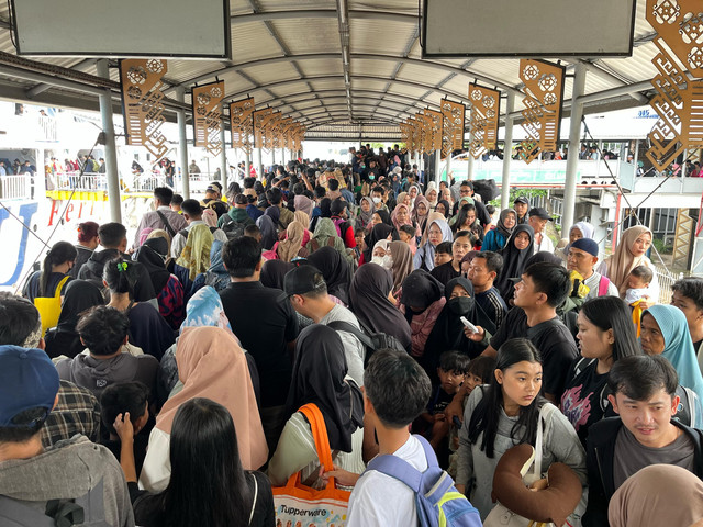 Ribuan orang membawa pejalan kaki ke pelabuhan, dan sepeda motor memenuhi kantong parkir dermaga.