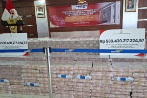 Uang pecahan seratus ribu rupiah disusun dengan rapi di dalam plastik transparan. Lembar-lembar disusun menjadi barikade sepanjang sekitar tiga meter.
